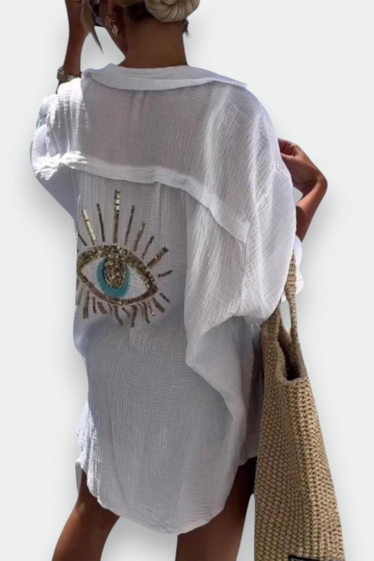Descubre la MiraGuard, una camisa bordada con lentejuelas y abalorios inspirada en el símbolo tradicional del mal de ojo. Esta prenda no solo brilla por su diseño, sino que aporta un toque protector cargado de misticismo y personalidad.